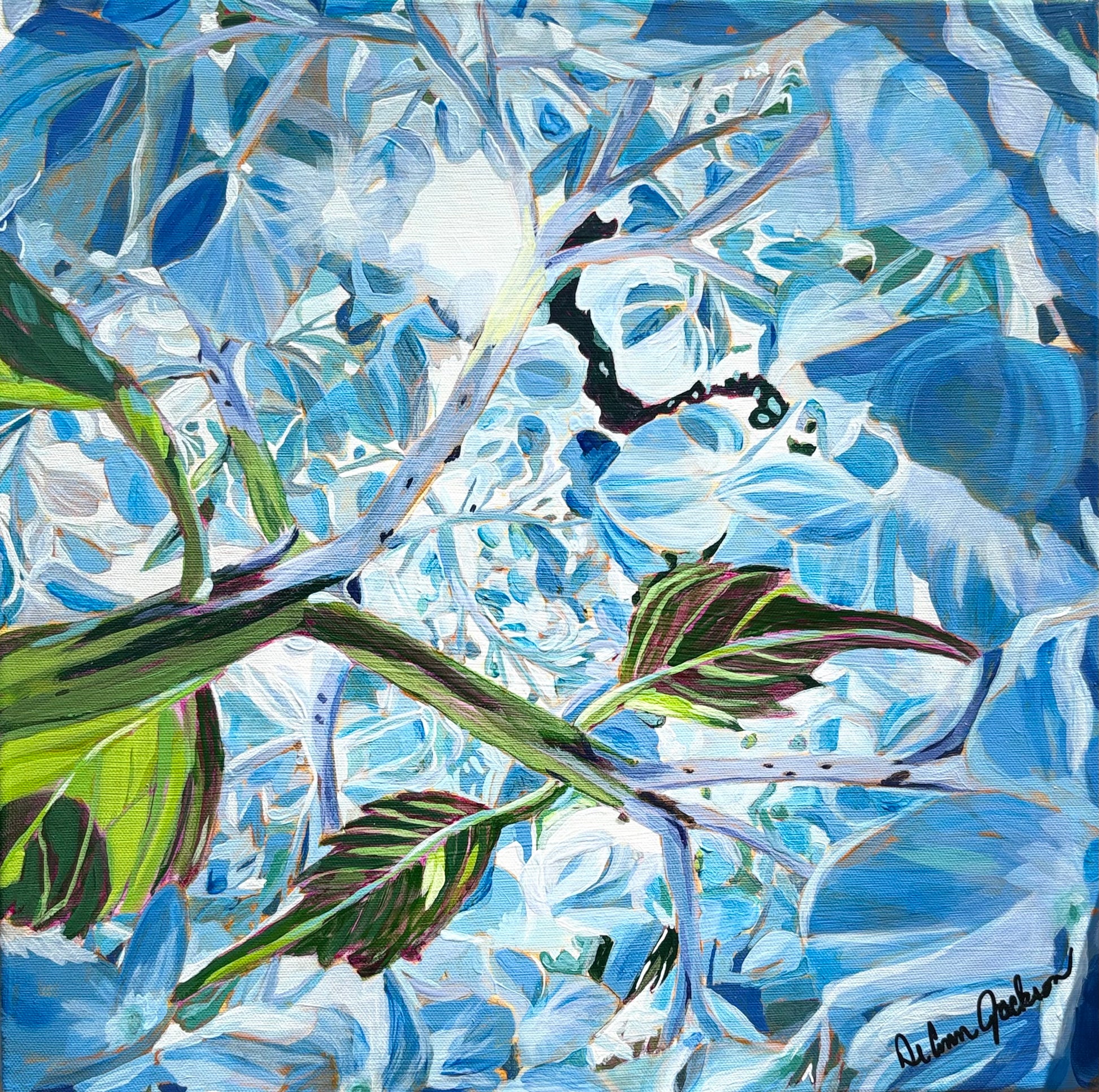 Original acrylic painting from the inside of the fully bloomed hydrangea bush. Some may call this abstract because of the perspective of the light. This is painted on a 16x16 inch, .5 inch in thickness canvas with finished edges in a monotones gray stencil. This is the first of 3 in my hydrangea collection. Be sure to view the other color variations and fun lighting.
